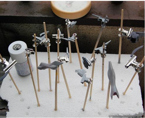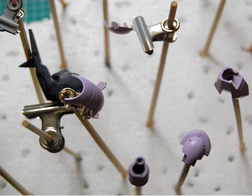 それはさておき、ガラッゾ君ですが、パーツに持ち手をつけて、サフりました。