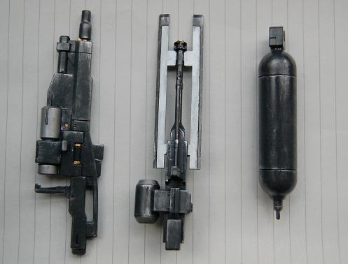 「武器っぽい金属っぽい、若干使用感のある雰囲気」(←限りなく不透明な感じッスね! しかも一つはタンクだし・・・)にしたかったので、ドライブラシ効果はかなり抑えてみました。